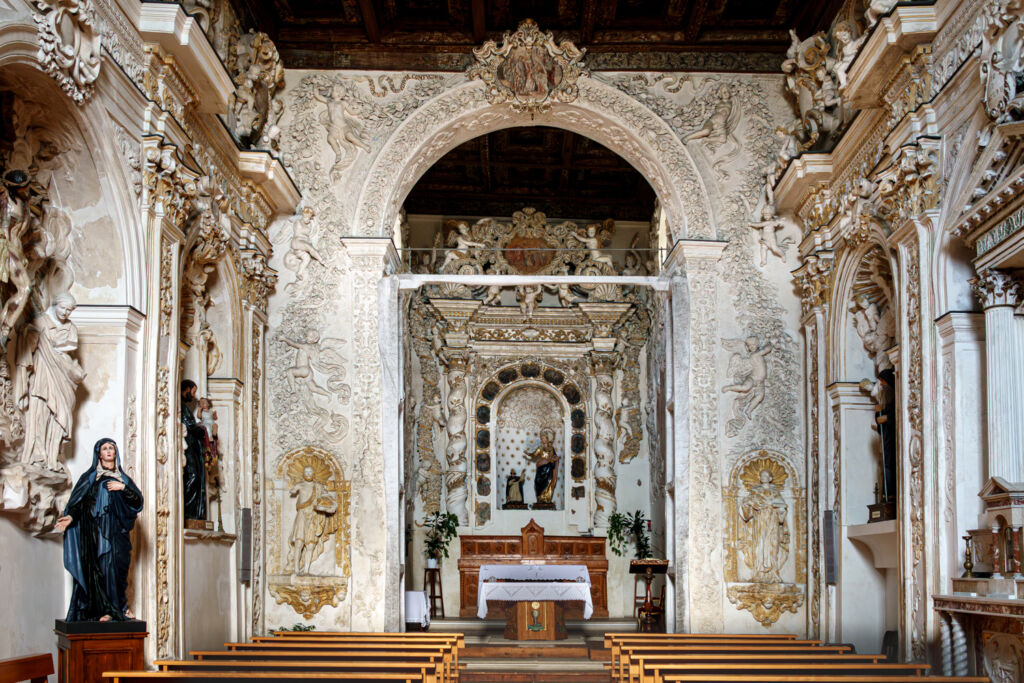 Nel centro urbano si staglia sulla piazza principale dell’abitato la chiesa del Rosario, edificata all’inizio del ‘700 e dichiarata monumento nazionale. Nonostante all’esterno si presenti con una semplice facciata a capanna ed un portale d’ingresso in pietra calcarea, l’interno stupisce il visitatore per la ricchezza dei suoi stucchi. Interessanti sono l’altare dedicato a San Giuseppe e le sculture ad altorilievo rappresentanti le Pie Donne, con al centro un pregiato crocifisso ligneo. Nell’edicola della parete absidale è collocata la statua lignea della Madonna del Rosario con San Domenico. Sulla parete sinistra del presbiterio si può ammirare un interessante affresco che raffigura la Vergine del Rosario col Bambino Gesù e ai piedi San Domenico, istitutore del Rosario come preghiera; mentre sulla parete destra è stato riportato in luce dall’ultimo restauro un affresco raffigurante l’ingresso di Gesù a Gerusalemme. Pregevoli sono il soffitto ligneo a cassettoni e il pavimento in maiolica (Fig. 1-3).