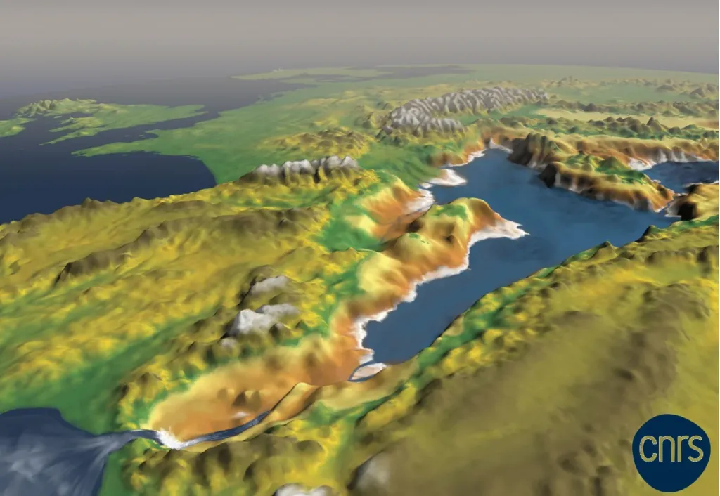 Fig. 1 Ricostruzione tridimensionale immaginaria del paleo Mediterraneo durante la crisi di salinità miocenica. L’immagine, con vista da Est verso Ovest, focalizza il momento della apertura della soglia di Gibilterra (in primo piano) alla fine del periodo evaporitico, circa 5 milioni di anni fa; fonte: Institut de Physique du Globe de Paris – CNRS; dal web.