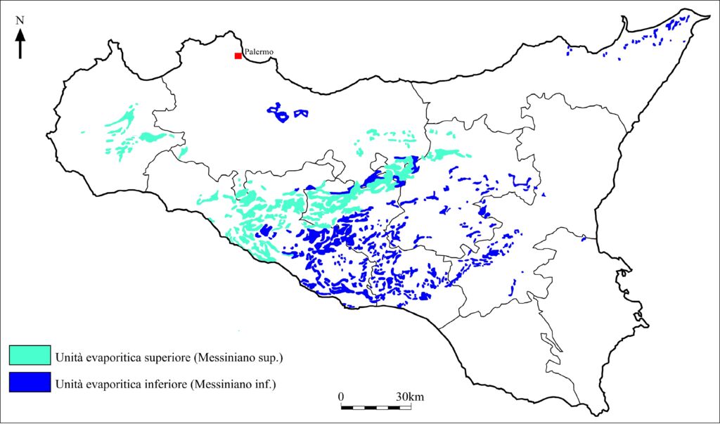 L’interruzione delle connessioni tra l’Atlantico e il paleo Mediterraneo ebbe una durata relativamente breve di circa 600.000 anni, sufficiente a lasciare una traccia indelebile nella geologia dell’area mediterranea; tale fenomeno caratterizza la parte più recente del piano stratigrafico Messiniano. Il lento, ma graduale, aumento della salinità delle acque del Mediterraneo è detta dai geologi Crisi di Salinità. Con l’evaporazione e la conseguente diminuzione del volume complessivo dell’acqua, l’aumento continuo della salinità innescò un fenomeno di precipitazione chimica dei sali disciolti nelle acque marine. Si venne quindi a formare una successione di rocce sedimentarie di origine chimica, costituita alla base da calcari e dolomie, poi dai gessi e infine dal salgemma e dai sali potassici, che i geologi chiamano Serie Evaporitica. Questa fase tormentata della storia geologica mediterranea avrà fine circa 5 milioni di anni fa e costituisce una presenza significativa nel panorama geologico Mediterraneo affiorando estesamente in diversi suoi settori, tra i quali la Sicilia, l’Italia meridionale e centrale, il Nordafrica e la Spagna. A seguito della chiusura del paleo Mediterraneo i sedimenti evaporitici si depositarono in grande quantità nell’Avanfossa, che occupa quasi per intero la porzione centro-meridionale dell’isola, articolandosi in due bacini di sedimentazione (Fosse di Caltanissetta e di Castelvetrano) separati dai Monti Sicani che rappresentano la propaggine meridionale de settore detto di Catena, che si sviluppa lungo la costa settentrionale dell’isola, dai Monti Peloritani all’arcipelago delle Egadi, ed è costituito da corpi geologici di età mesozoica e cenozoica, con carattere e litologie differenti, tettonicamente sovrapposti. Esso ha dato origine all’Appennino Siculo (segmento dell’Orogene Appenninico-Maghrebide). L’avanfossa è chiamata anche Altopiano solfifero per la presenza dello Zolfo che caratterizza i termini carbonatici della successione evaporitica ed era conosciuto e cavato fin dall’antichità