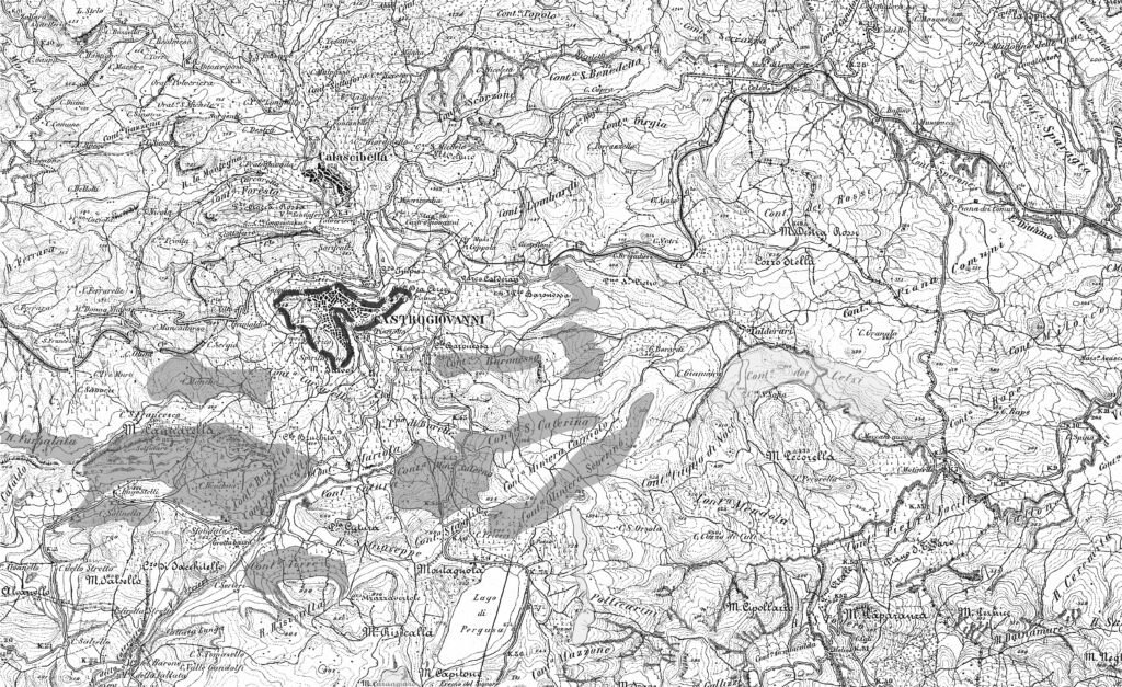 Fig. 1 Stralcio dell’IGM di Castrogiovanni (Enna) del 1895, in grigio le località di cava del gesso