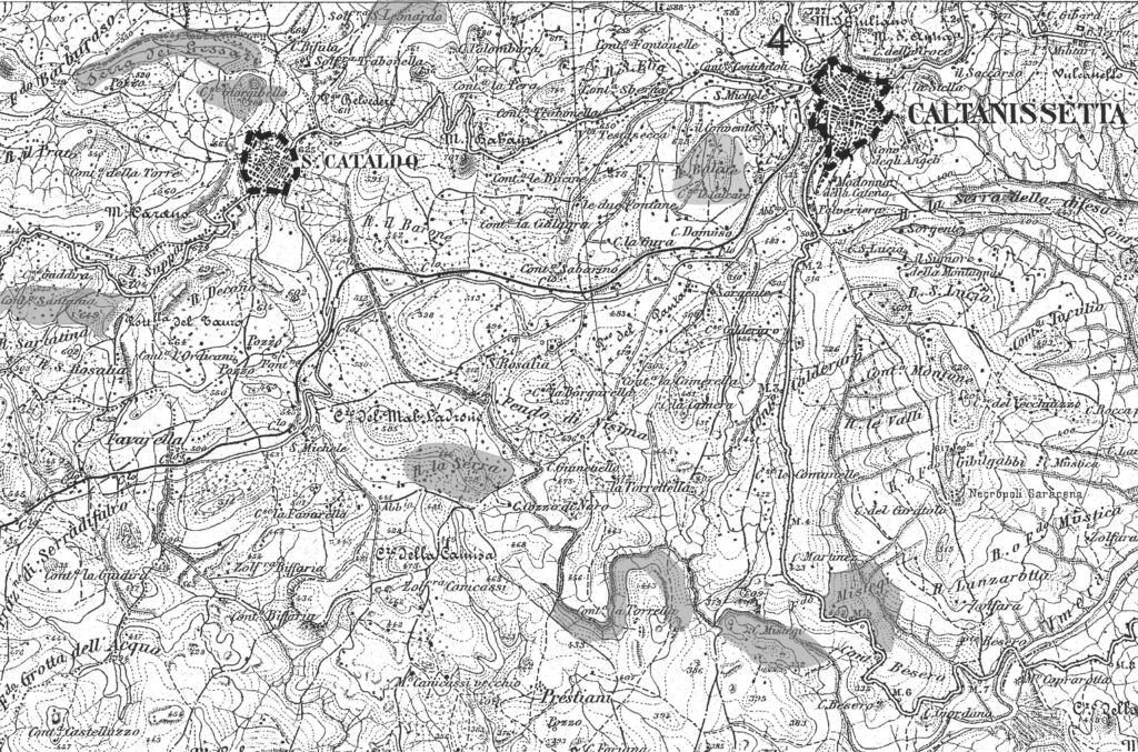 Fig. 2 Stralcio dell’IGM di Caltanissetta del 1895, in grigio le località di cava del gesso